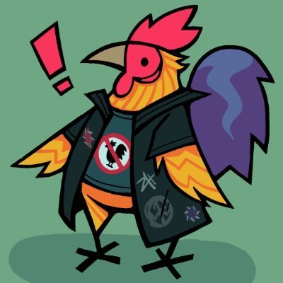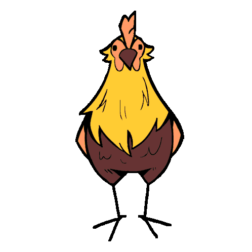 A stylized, glitch-effect chicken or rooster rapidly spins, showcasing its unique split-color design and quirky animation.