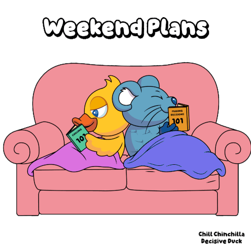 a cartoon of a duck and a mouse sitting on a pink couch reading weekend plans