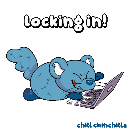 A cute blue cartoon chinchilla intently typing on a laptop, with the text 'locking in!' and 'chill chinchilla'.