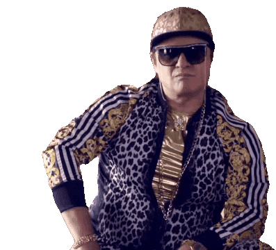 Chimo Bayo, the iconic DJ, poses confidently in a striking gold and leopard print tracksuit with cool shades.