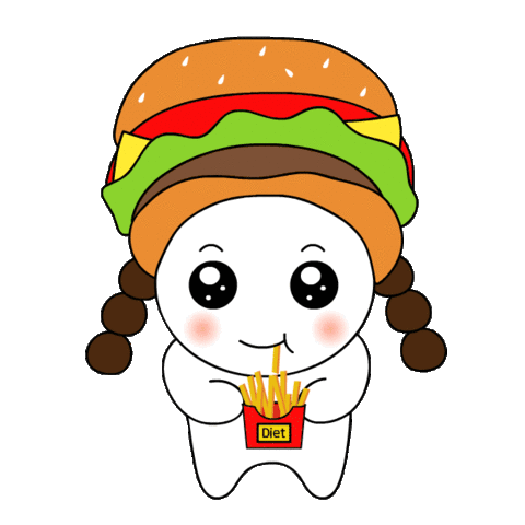 A cute cartoon character wearing a hamburger hat and pigtails, happily eating french fries from a 'Diet' labeled carton.