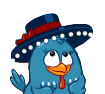 Galinha Pintadinha, the cheerful blue chicken, sways happily in a festive sombrero, smiling brightly.