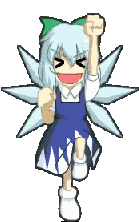 The adorable Touhou character Chirumiru, a fairy girl in a blue dress, joyfully dances with excitement and happiness.