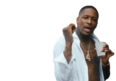 Rapper YG makes a 'Choo Choo' fist pump gesture while holding a cup, showing excitement.
