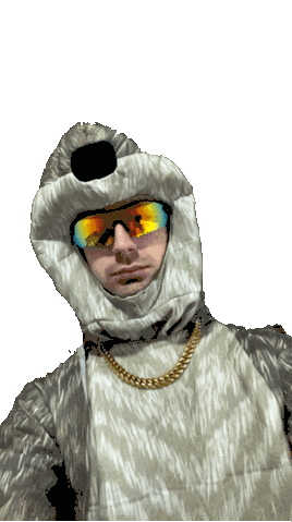 Chris TDL Group's Philippe Paradis in a furry grey costume, wearing reflective rainbow sunglasses and a gold chain.