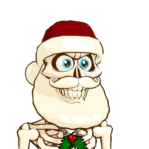 A skeleton Santa Claus, wearing a red hat and white beard, gives a thumbs up and holds a candy cane, celebrating Christmas.