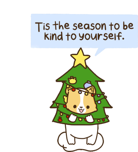 A cute corgi dog dressed as a Christmas tree with lights and a star, reminding you to be kind to yourself this season.