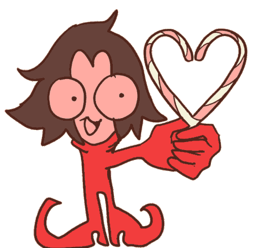 A cheerful cartoon Christmas elf with big eyes holds two candy canes shaped into a heart, expressing love.
