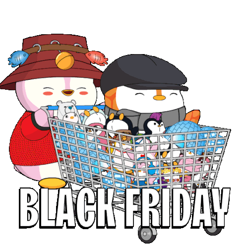 A cute character pushes a shopping cart overflowing with many penguins, celebrating Black Friday sales.