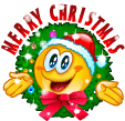 A cheerful yellow smiley face adorned with a Santa hat and a festive Christmas wreath, holding another wreath.