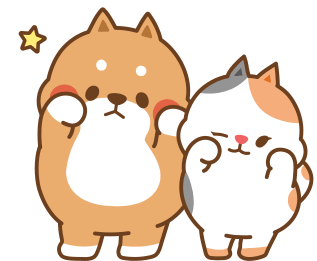 Chubby Tonton Friends characters Yuta the dog and Bella the cat make a cute, shy gesture with their paws.