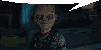Chucky, the pixelated doll, holds a weapon with a blank speech bubble above his head.