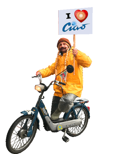 A man with a mustache and braided hair rides a blue Piaggio Ciao moped, holding a sign that says 'I ❤️ Ciao'.