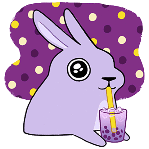 An adorable light purple rabbit with big eyes happily sips a refreshing boba tea drink through a straw, set against a polka dot background.