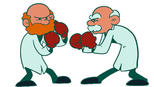 Two cartoon scientists in lab coats and boxing gloves face off in a humorous fight, symbolizing disagreement or a scientific debate.
