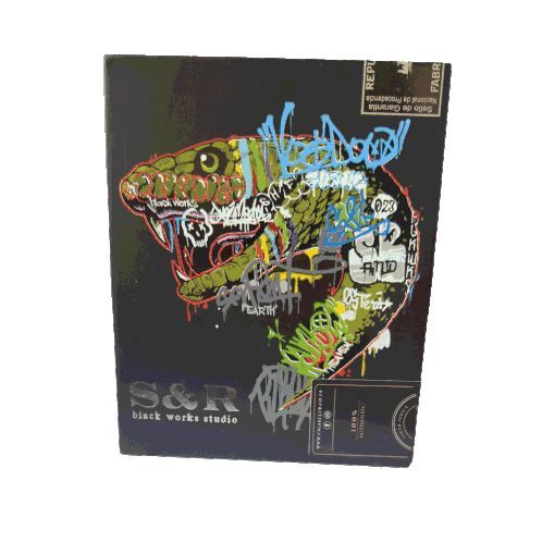 A rotating cigar box from Black Works Studio, featuring a vibrant graffiti-style serpent design and 'S&R' branding.