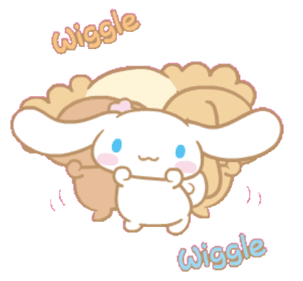 Cinnamoroll, a cute Sanrio character, wiggles happily with its friends Cappuccino, Chiffon, and Mocha.