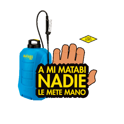 A blue Matabi sprayer is protected by a large hand, with the Spanish phrase 'No one touches my Matabi' from Cisa Agro.