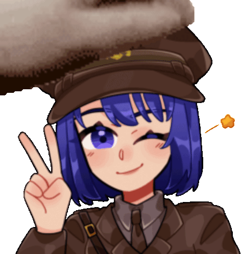 Anime girl Claire winks and makes a peace sign while receiving gentle headpats from a fluffy hand.