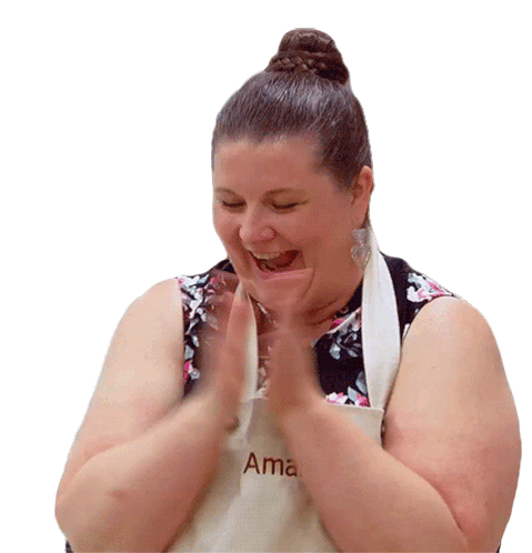 Amanda Muirhead claps her hands together with a wide, joyful smile, showing excitement and happiness.