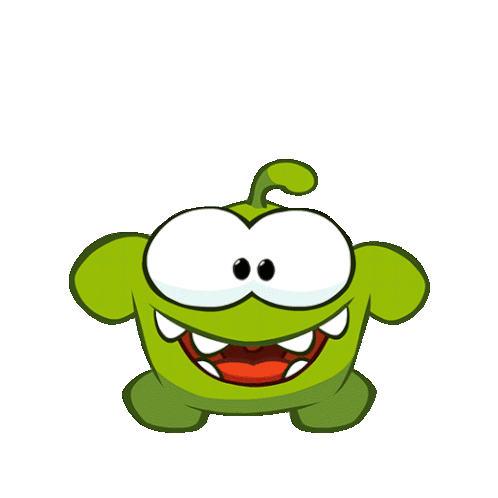 Om Nom, the cute green monster from Cut the Rope, claps his hands happily with a wide smile.