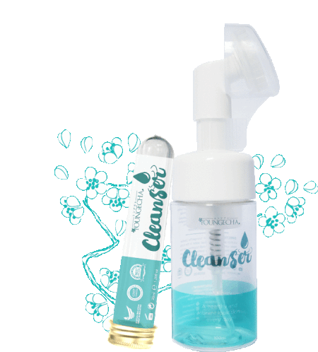 a bottle of youngcita cleanser next to a tube of it