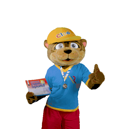 Cleo, the mascot from Sportbedrijf Rotterdam, proudly holds her swimming diploma, celebrating a successful swim lesson with Otto.
