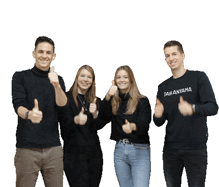 Lies Van Den Bersselaar, Marjolein Beerendonk, and two others give a cheerful thumbs up, one wearing a 'baka' sweater.