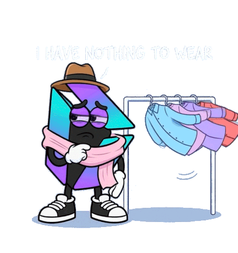 a cartoon character is standing in front of a rack of clothes with the words " i have nothing to wear " in the background