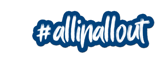A dynamic white brush-stroke hashtag #allinallout with a bold dark blue outline, standing out against a clean white background.
