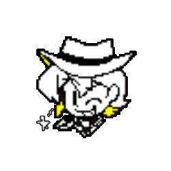 Clover from Undertale Yellow, wearing a cowboy hat, performs a rapid and energetic spin in this pixel art sticker.