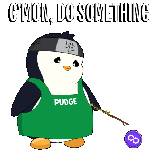 A Pudgy Penguin in a green apron with 'PUDGE' holds a Polygon crypto coin on a stick, urging 'C'mon, do something'.