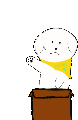 Cute animated sticker featuring Coco the dog winking and waving from a box, associated with Coco Rice and Raisa.