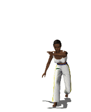 A woman in white capoeira attire performs the Cocorinha move, transitioning from a squat to a standing position.