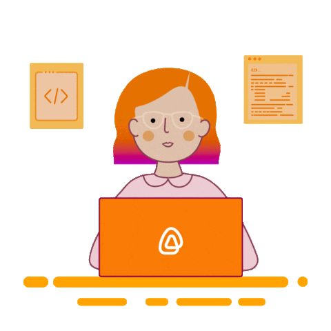 A vibrant cartoon woman with orange hair and glasses is diligently coding on an orange laptop, surrounded by programming icons.