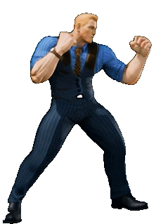 Cody from Street Fighter V in a sharp blue pinstripe suit, ready for battle in a dynamic fighting pose.