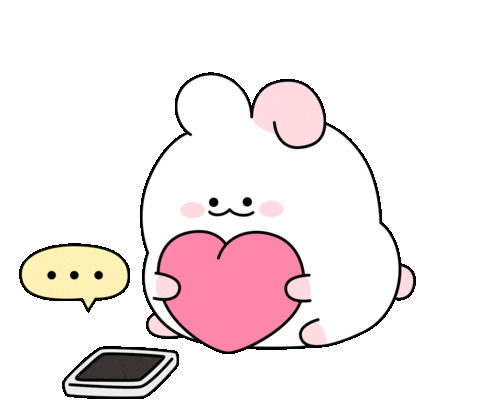 A cute cartoon rabbit holds a pink heart, with a speech bubble showing an ellipsis, next to a phone.