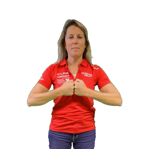 Sam Davies, wearing a red Initiatives Coeur shirt, expresses surprise with hands raised.