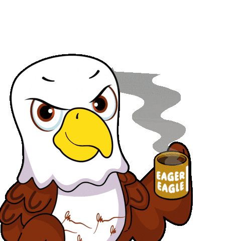 a cartoon bald eagle holding a cup of coffee that says eager eagle on it
