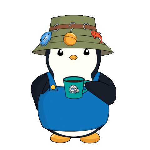 A cute penguin in a fishing hat sips a warm mug of coffee, conveying a sense of calm and readiness for the day.