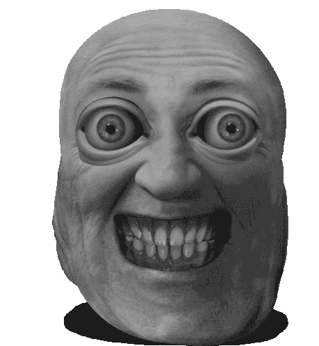 Colin Raff's grotesque, bald, potato-like face with wide, darting eyes and a disturbing, toothy grin.