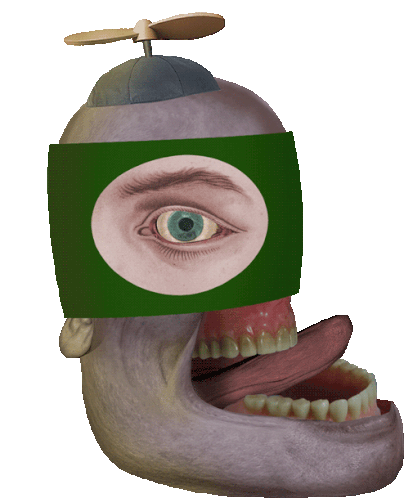 Colin Raff's grotesque and surreal animated head features a spinning propeller, a green eye that pops out, and a long tongue licking.