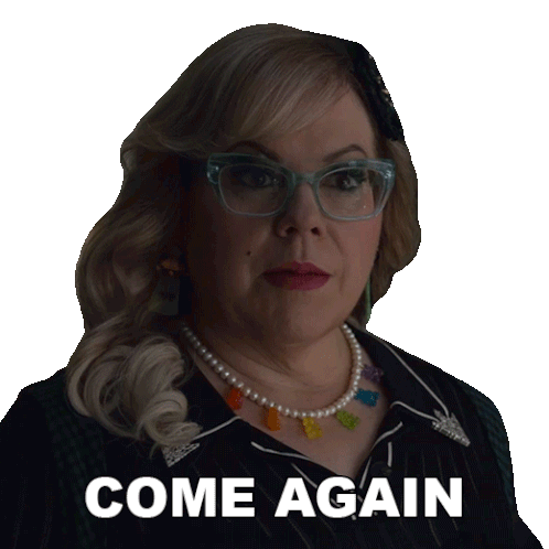 Penelope Garcia, wearing glasses and a pearl necklace, asks "Come Again" with a questioning expression.