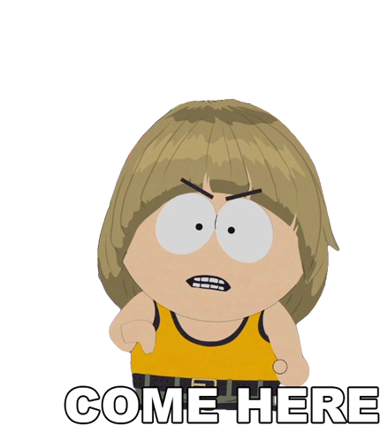 Billy Thompson from South Park, looking angry and pointing, demands 'COME HERE' in this animated sticker.