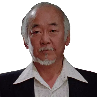 Mr. Miyagi from The Karate Kid, portrayed by Pat Morita, gestures and says "COME HERE".