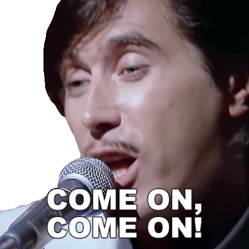 Bryan Ferry passionately sings into a microphone, with the energetic caption "COME ON, COME ON!" displayed.