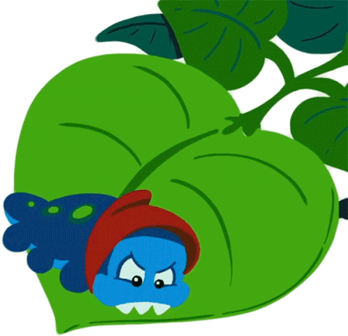 A blue caterpillar with a red cap curiously eats a green leaf, taking bites and changing its expression.