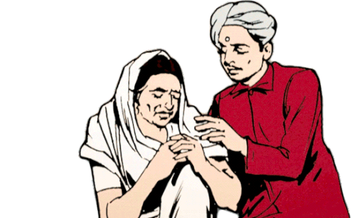 A man in traditional attire comforts a woman, reflecting a scene from Amar Chitra Katha, offering solace.