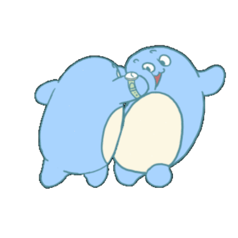 Two light blue, blob-like cartoon characters are engaged in a playful fight, with one character punching the other.