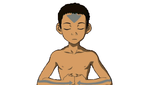 Aang, the Avatar, is shown meditating with his eyes closed, focusing intently as his arrow tattoo glows.